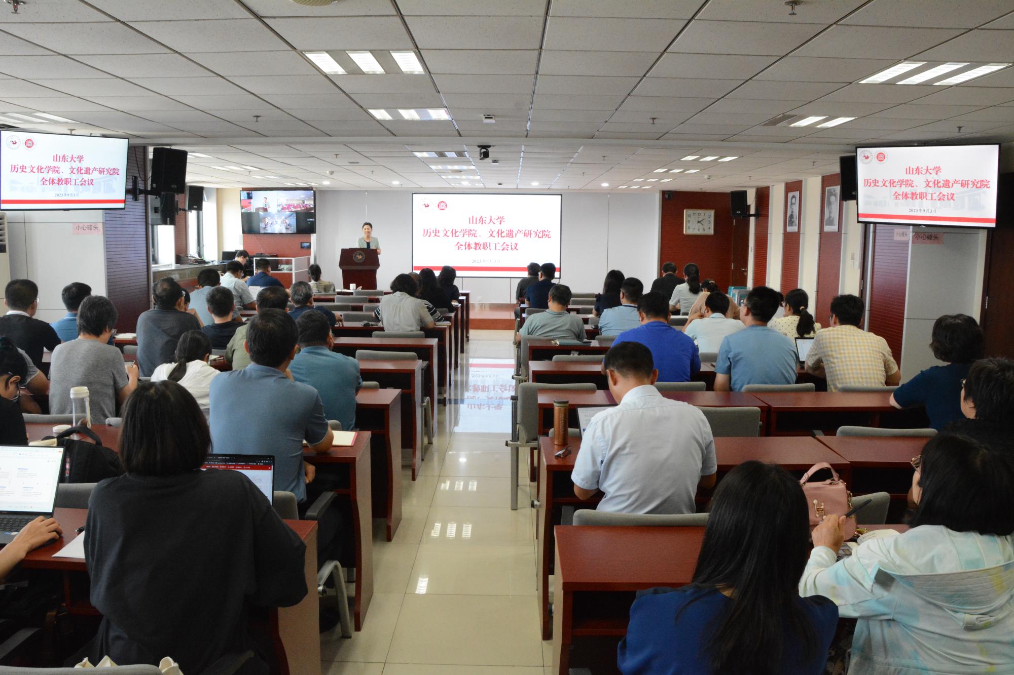 9月3日,历史文化学院、文化遗产研究院召开全体教职工会议,传达学校2023年秋季学期工作会议精神,总结学院(文研院)春季学期工作,研究部署秋季学期重点工作。院长方辉出席会议并讲话。党委书记刘军主持会议并讲话。学校主题教育第一指导组副组长刘冰列席会议。