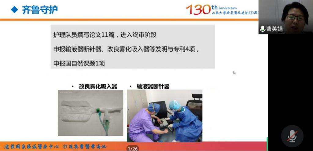 随后,曹英娟主任详细介绍了在援助过程中齐鲁医院援鄂医疗队所承担的责任之重,压力之大,并分享了医者与病患之间的温暖故事。让同学们真实感受到了援鄂医者面对困难坎坷的坚韧不拔和照料病人、友爱同事的温暖大爱。她还谈到了齐鲁医院援鄂医疗队针对攻克疫情贡献的力量,包括创新开展工作,制订行之有效的管理手册,申报多项专利发明,开展国外交流等,充分体现了山大人的坚韧与担当。