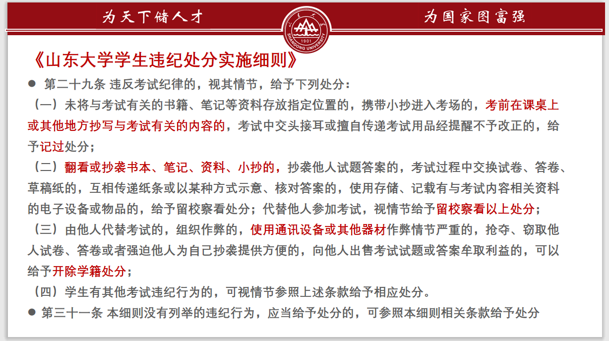 首先,朱嘉铭老师强调了考试纪律与考场要求,提醒同学们提前登陆教务系统查看考试安排,考试前带齐证件,提前半小时到考场。随后,朱老师带领同学们一起学习了《山东大学学生违纪处分实施细则》,通过强调有关考试纪律的规定并结合具体案例,提升同学们的纪律观念,强化“红线意识”。最后,朱老师对大家提出几点期待和要求。作为在山大学习生活三年的本科生,大家经过此次疫情,在政治上、思想上都应该有所提升,做有担当、有责任的大学生,不要把目光局限于单纯的学习成绩上,而应该全方面提升个人能力和水平,力争在考试中取得理想成绩。会上,朱老师就2018级本科生离校及返校事项进行传达和安排。