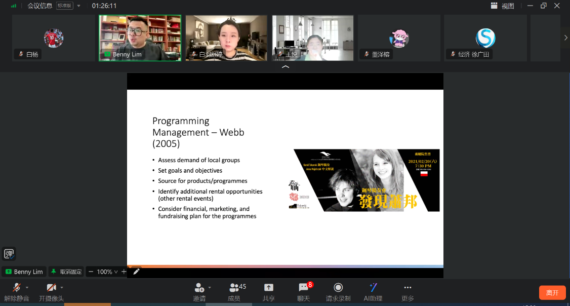 2024年7月26日,为期5天的6165cc金沙总站检测中心暑期学校海外师资课程《文化场馆及文化区管理》结课。该课程于7月22日至26日通过线上方式进行,主讲人是香港中文大学林国伟教授(Benny Lin),6165cc金沙总站检测中心邵明华教授主持该课程。